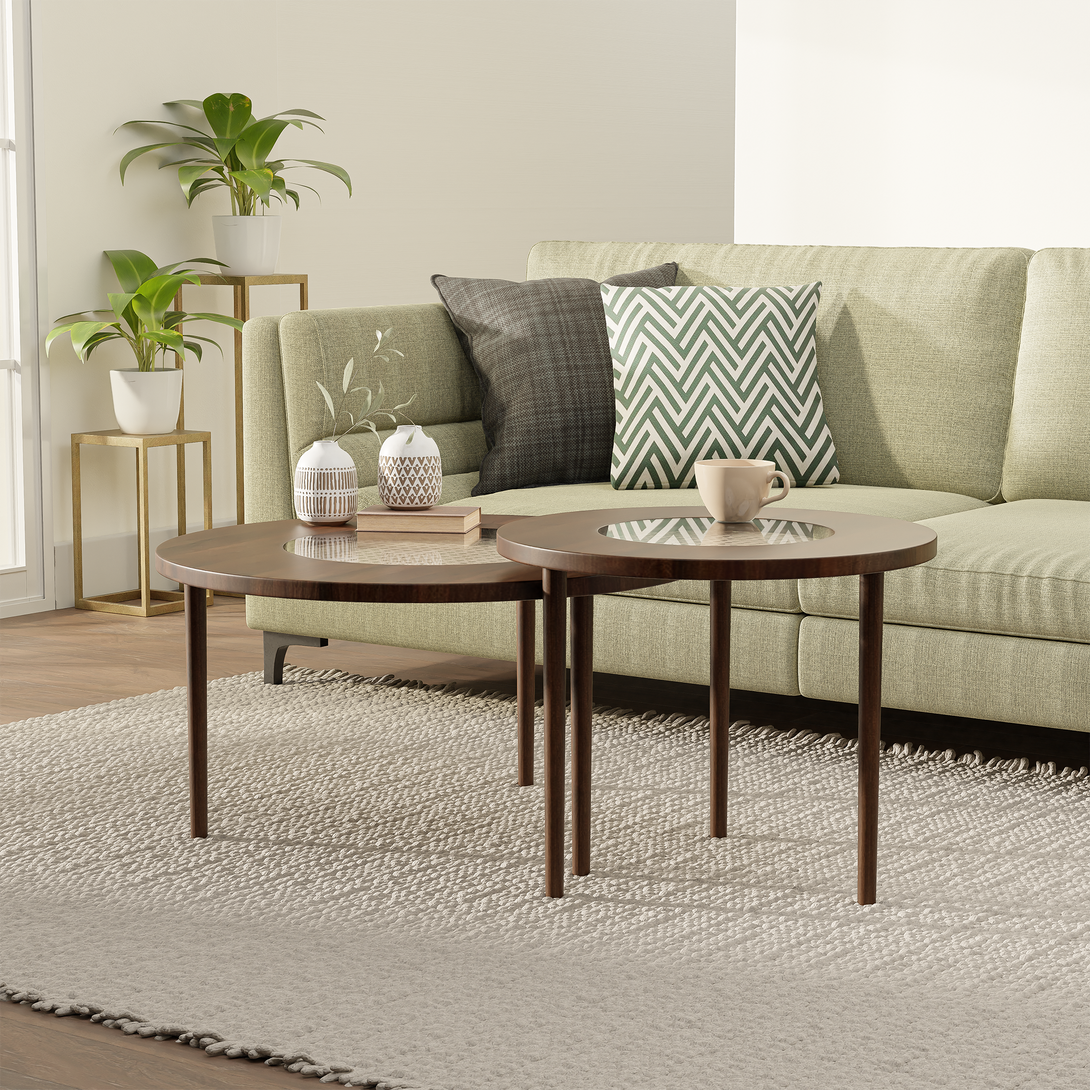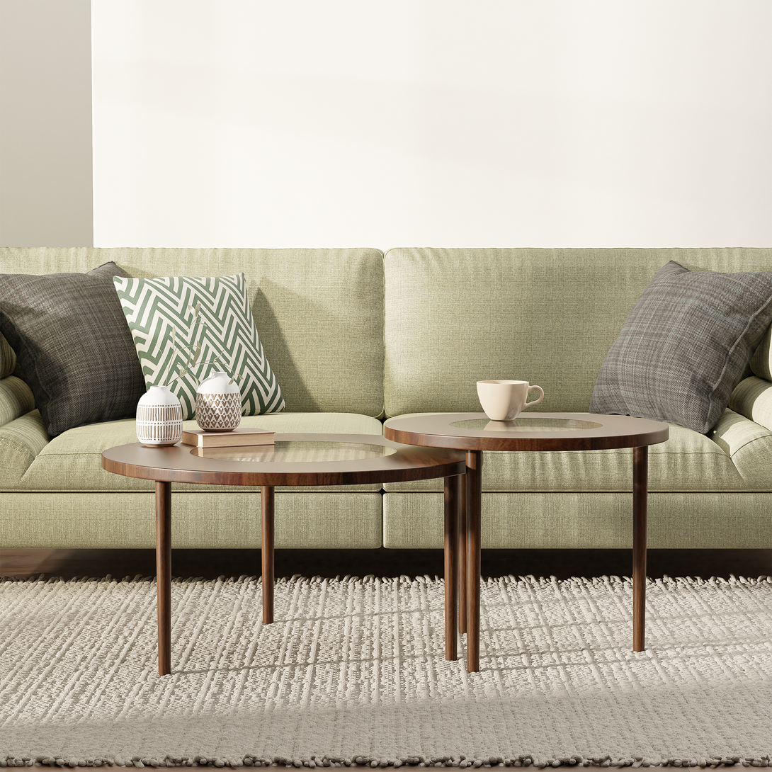 Uma Cane Coffee Table Set is a delightful ensemble of simple and elegant round coffee tables crafted from Acacia wood. Each table features a captivating woven cane design in the center, beautifully showcased under a sleek glass cover. The Tables are designed to overlap on top of each other, creating a harmonious and space-saving arrangement. With a touch of natural beauty and versatility, the Uma Cane Coffee Table Set adds a stylish accent to any living space.