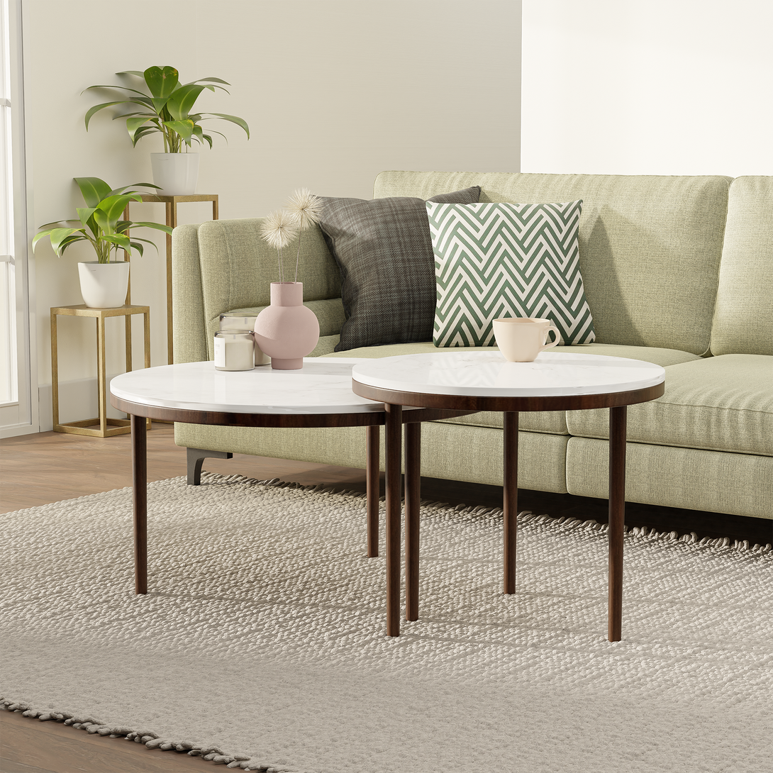Uma Marble Top Coffee Table Set is a delightful ensemble of simple and elegant round coffee tables crafted from Acacia wood with Marble tops . This set features tables that overlap on top of each other, creating a harmonious and space-saving arrangement. With a touch of natural beauty and versatility, the Uma Marble Top Coffee Table Set adds a stylish accent to any living space.