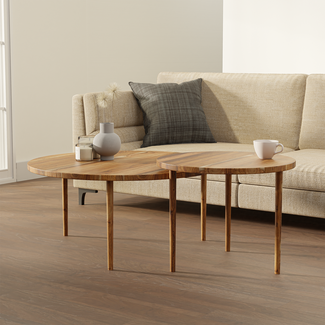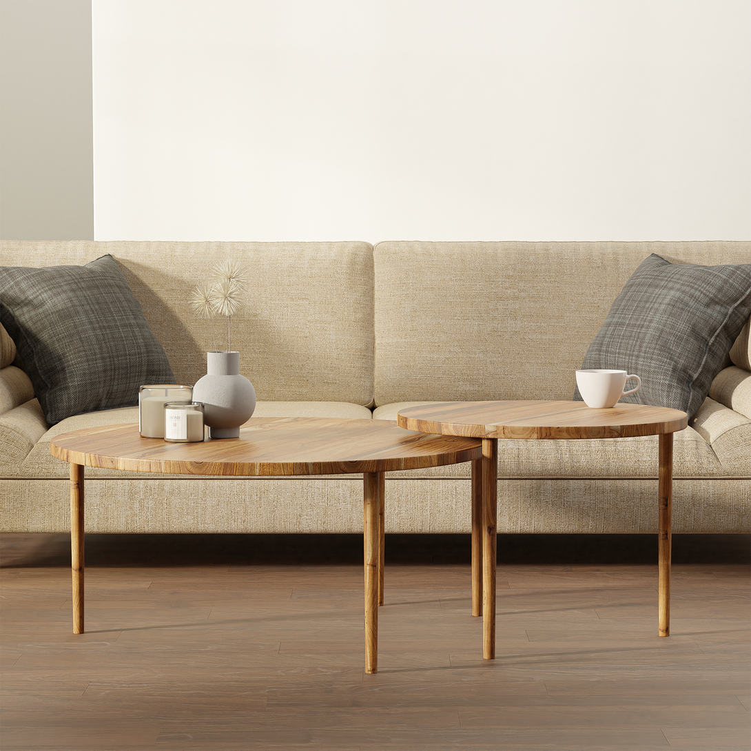 Uma Coffee Table Set is a delightful ensemble of simple and elegant round top coffee tables crafted from Acacia wood. This set features tables that overlap on top of each other, creating a harmonious and space-saving arrangement. With a touch of natural beauty and versatility, the Uma Coffee Table Set adds a stylish accent to any living space.